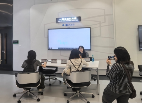 随后,师生走进视源全球展厅。这里汇聚了企业在智慧教育、高效会议、智能家居等领域的创新成果。从熟悉的“希沃”智慧教学产品到引领协同办公的MAXHUB会议平板,丰富的场景化解决方案展示了技术如何深度融入生产与生活。